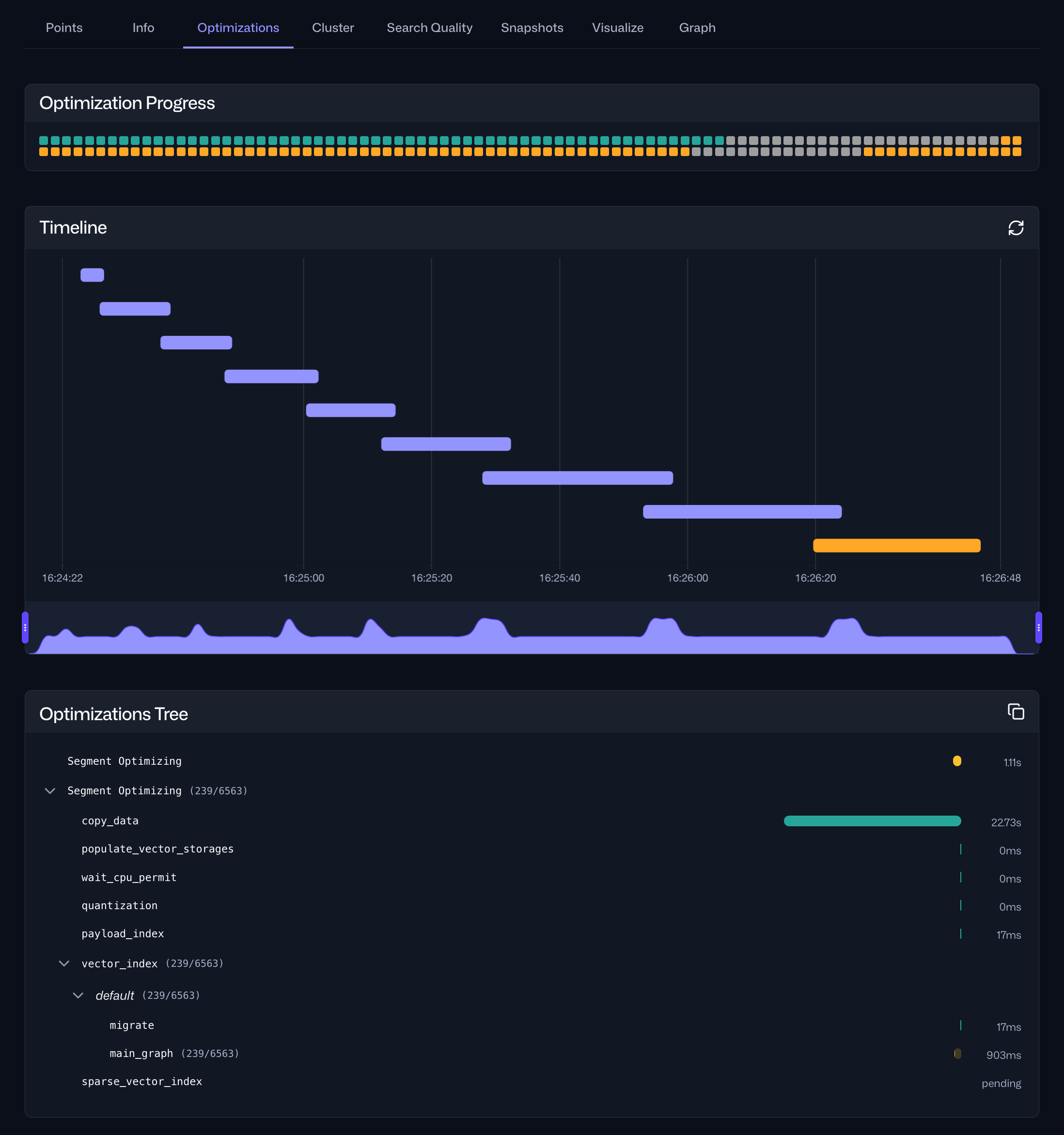 A new /collections/{collection_name}/optimizations API endpoint provides cluster-wide information about the current optimization status, as well as detailed information for current and past optimization operations. Because the output of the API can be verbose, we’ve added a new Optimizations tab to the Collections interface in the Web UI that makes it easier to analyze the data. Here, you can find an overview of the current optimization status, a timeline of current and past optimization operations, and a breakdown of the tasks in a specific cycle and their durations.